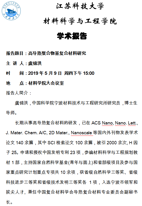 讲座预告|虞锦洪:高导热聚合物基复合材料研究( 2019.05.09)