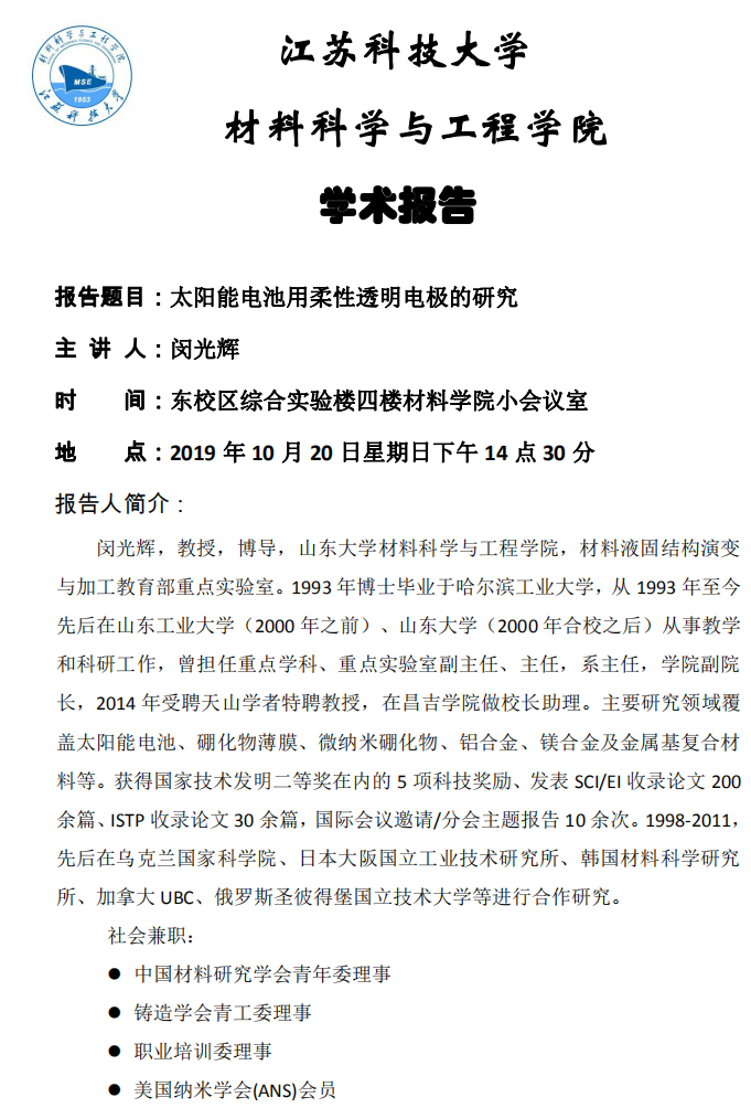 讲座预告|闵光辉:太阳能电池用柔性透明电极的研究( 2019.10.20)