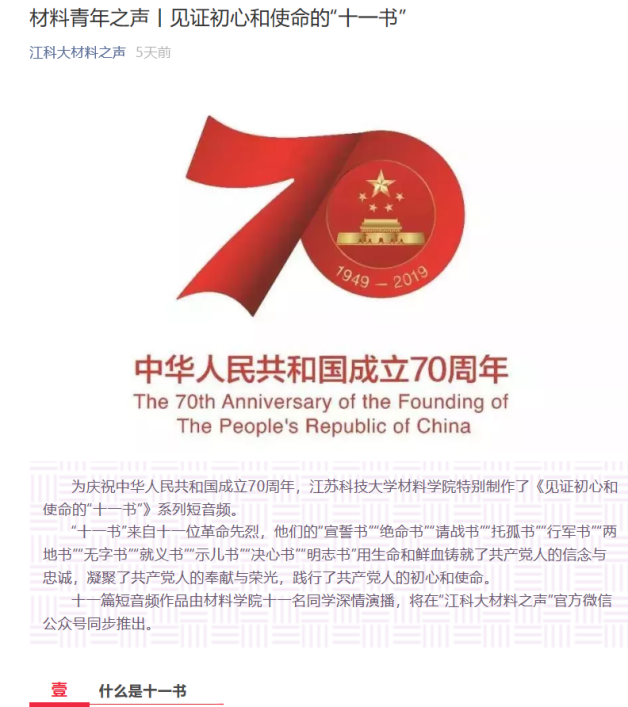 精心策划材料青年之声栏目。在《见证初心和使命的“十一书”》的学习中,学院精心策划,勇于创新,将学习成效落到实处。通过组织十一名学生深情录制短音频,用自制语音、图画和文字等丰富的形式,介绍“十一书”的内容和历史背景,并在学院江科大材料之声微信公众号率先进行推送,收到学校老师和同学们的广泛好评。新媒体具有宣传面广和宣传形式生动活泼、易于受众接受的特点。通过微信语音、图画推送的形式,将传统的主题教育变成师生们喜闻乐见的内容,并且可以随时随地的学习。