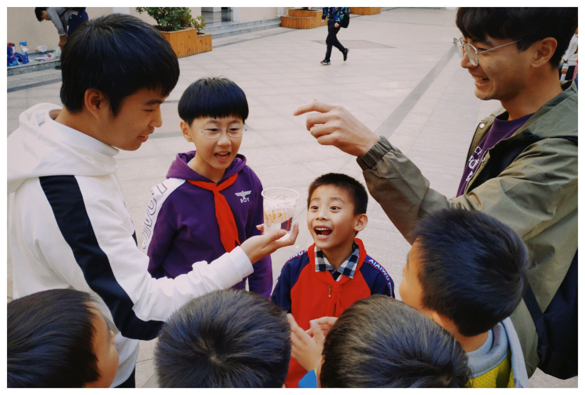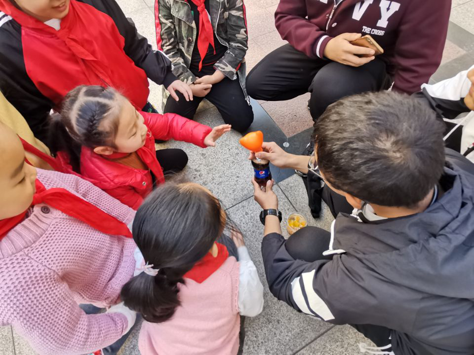 活动中,江科大材料学院的学生们给镇江市实验小学的同学们带来丰盛的“科技大餐”。美丽的降雨云、可乐喷泉、塑料瓶吹气球、法老之蛇等实验,这些有趣的科技活动让小学生大饱眼福,耳目一新,实验过后,各组活动负责人给同学们答疑解惑,同学们积极参与,充分感受到了科学带来的快乐和魅力。通过科普知识小问答环节,涉及中国最大的岛屿是台湾岛、社会主义核心价值观等内容,在他们心中种下了一颗科技强国的种子。