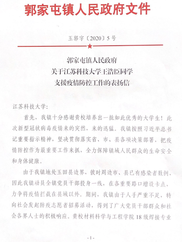 (王浩臣获抗“疫”表扬信)