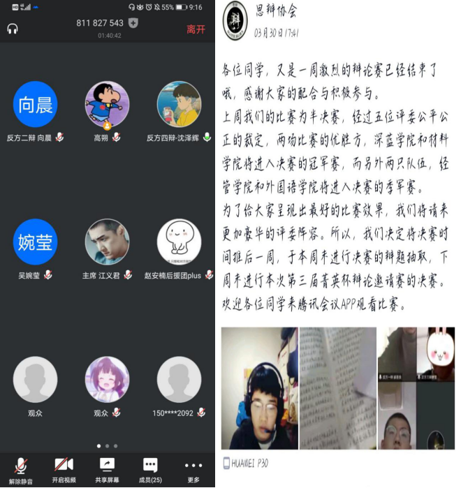 此次比赛借助腾讯会议进行线上辩论。参赛队伍主要来自材料学院、人文社科学院、理学院等十多个学院80余人参加。经过层层角逐,深蓝学院和材料学院进入最后的决赛。决赛过程中,大家丝毫没有受到比赛方式不同的影响,依旧气势汹汹,以唇为枪舌为剑,牢牢抓住对方所说的每一处纰漏,并且进行反击,引经据典,字字珠玑,全场环绕着紧张的气氛。正是由于线上比赛全程公开,让更多的同学都能尽情欣赏这场精彩绝伦的对弈。这次线上辩论邀请赛,不仅帮助江科大学生在特殊时期依然保持思想的活跃,享受语言的碰撞,还促进了各个学院之间的联系。