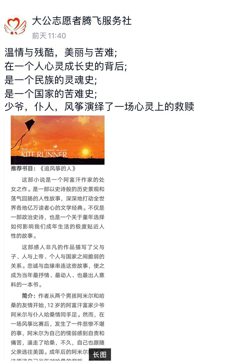 这次读书活动的推荐范围极为宽广,题材丰富,有《活着》带我们体悟艰苦生活磨不去的不屈,福贵带着沧桑和平静一路向我们走来;有《撒哈拉的故事》为我们讲述沙漠里的别样风情,奇女子三毛在苍茫而神秘的沙漠里大笑;有《在最深的红尘里相逢》则让我们了解雪域高原一代活佛仓央嘉措的传奇人生,住进布达拉宫,他是雪域最大的王,流浪在拉萨街头,他是世间最美的情郎……当然,还有《追风筝的人》《教父》《一个叫欧维的男人》等经典名著。优质小小说《半生缘》更是亮点,把时代洪流下一对平凡夫妻的爱情娓娓道来,腾飞项目组希望用小篇幅的文章重新唤起大家对阅读的热爱。