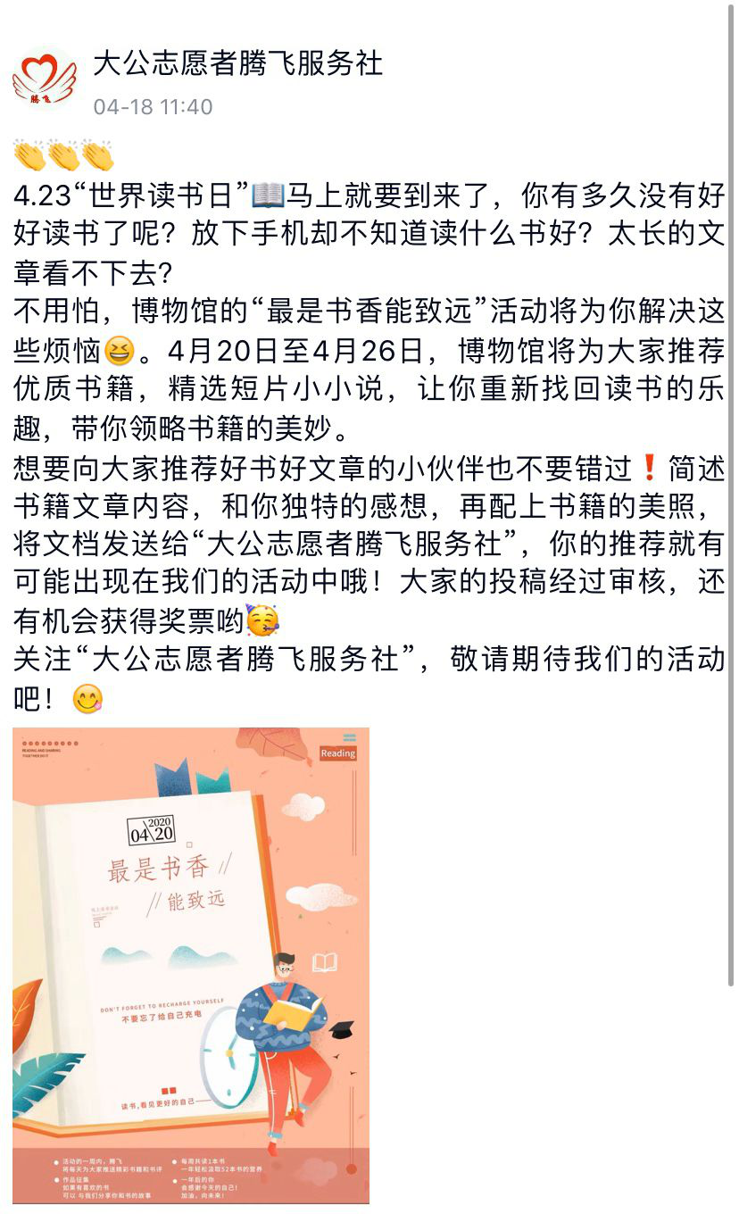 胸藏文墨怀如谷,腹有诗书气自华。在第25个世界读书日到来之际,材料学院腾飞博物馆项目组通过QQ公众号开展“最是书香能致远”优质图书分享活动。
