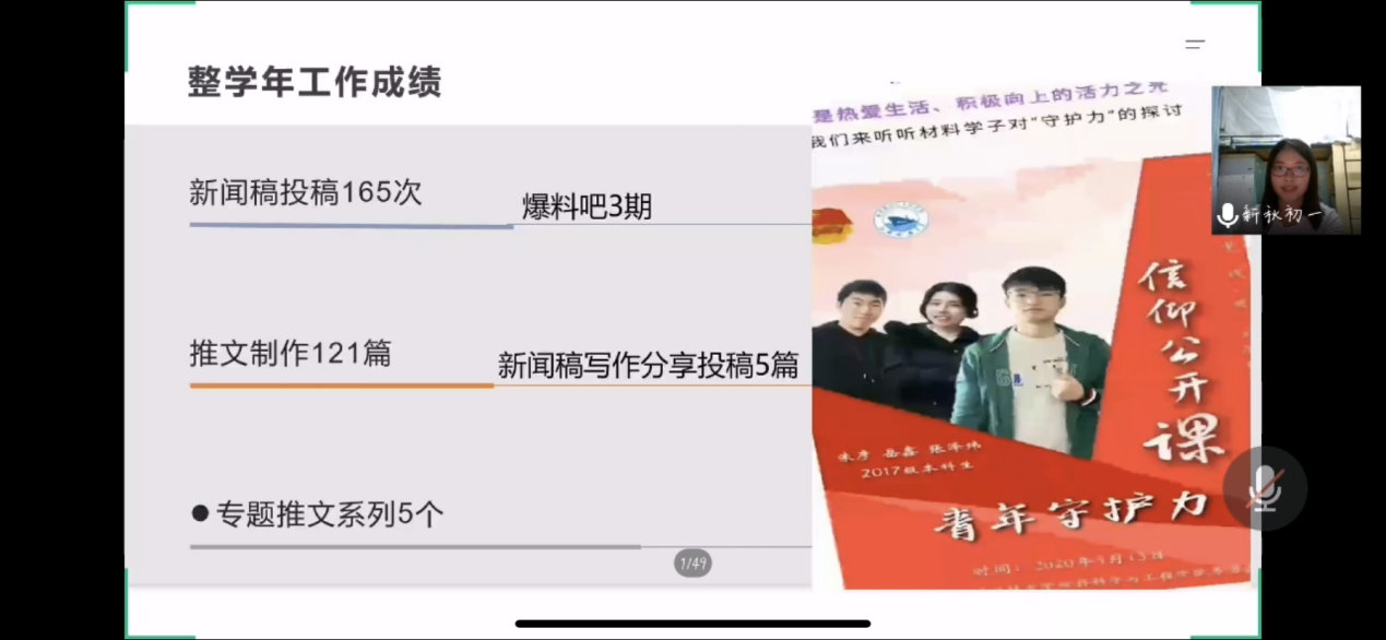 大会开始,由团委组织部率先进行工作汇报,随后各部门依次进行总结工作。工作总结结束后,每个部门提出了对部门存在问题的改进计划以及对部门未来的发展计划。汇报过程中流程有序,工作总结突出。其中社团部展示出一个总结视频,回顾了19-20年来社团部走过的点点滴滴,视频最后,社团部每位部员都对部门送上了自己的祝福。视频形式独特新颖,向大家展现了社团部的风采。所有部门全面生动立体地总结出各部门在疫情之下完成的任务,有宣传部的线上系列战疫云讲演推文、有文艺部的线上校园文化艺术节、有外联部的线上赞助、有关爱中心项目组的一系列线上活动……疫情之下,材料学院团学组织的工作仍然有条不紊,多姿多彩。