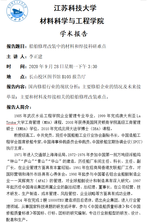 讲座预告|李正建:船舶修理改装中的材料和焊接科研难点(2020.09.28)