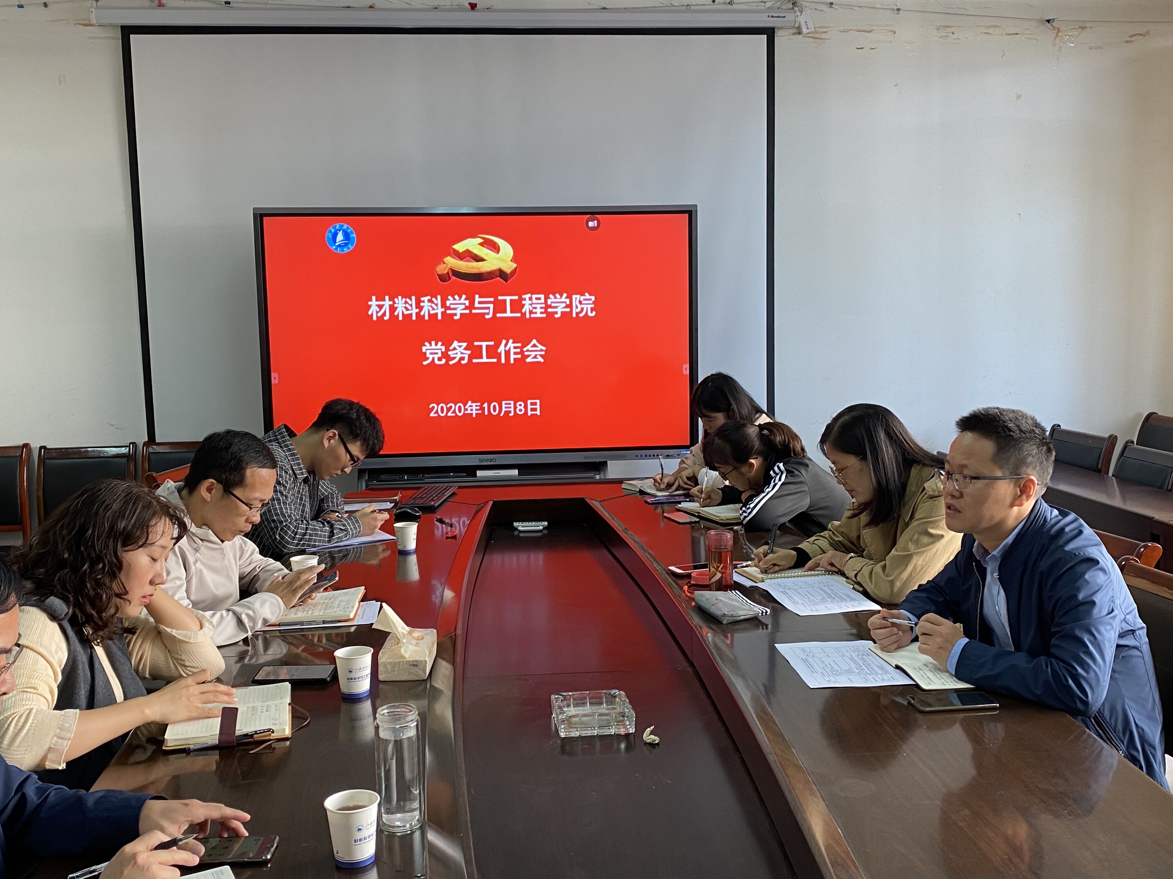 为贯彻落实学校2020年党建工作总体要求和重点任务,以高质量党建引领学院事业高质量发展,10月8日上午,材料学院党委组织召开2020年秋季学期党务工作会议。材料学院党委书记晏超、副书记赵莉出席会议,各教师党支部、研究生党支部和本科生党支部书记参加会议。会议由赵莉主持。