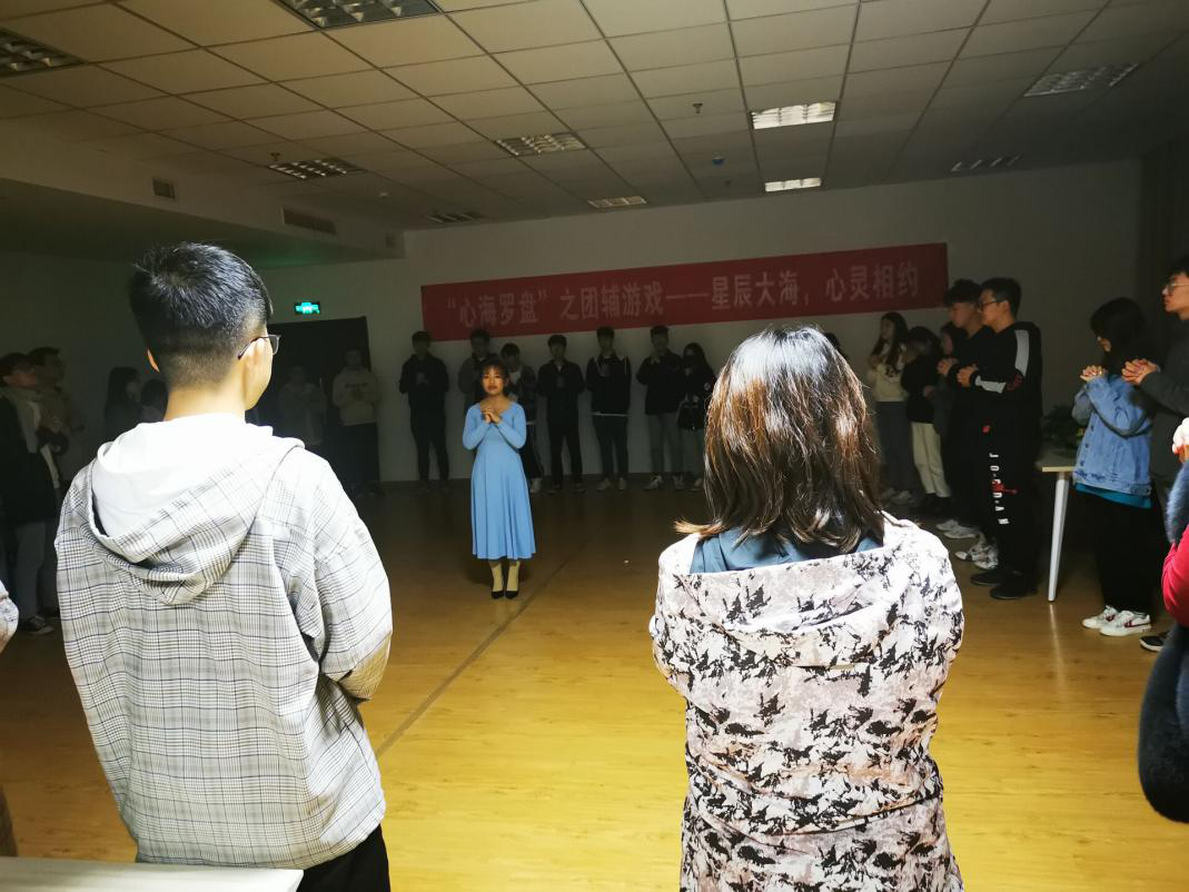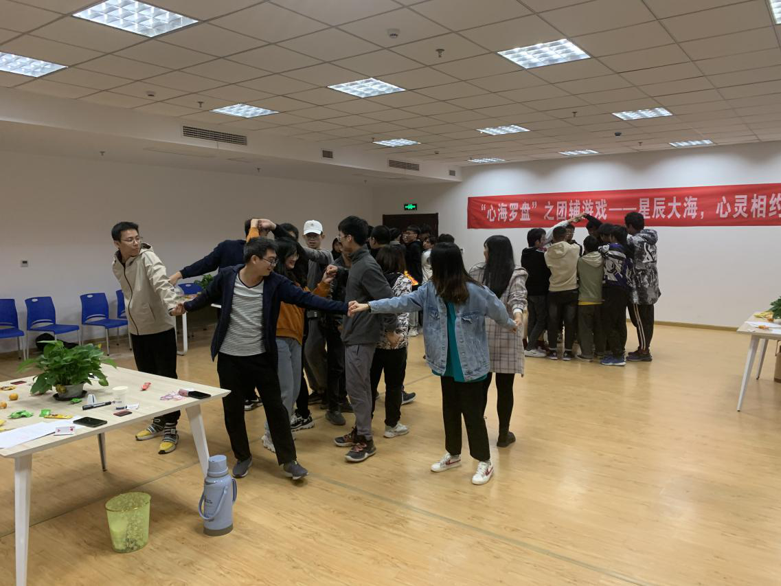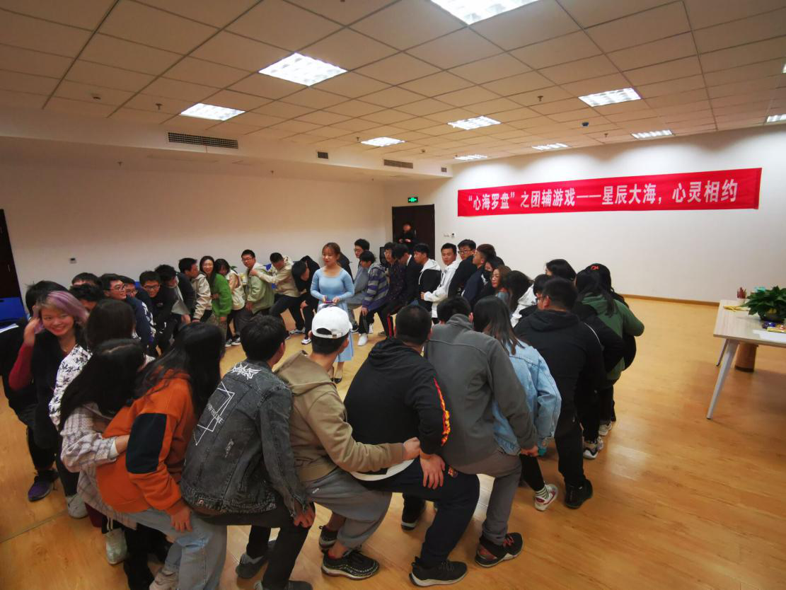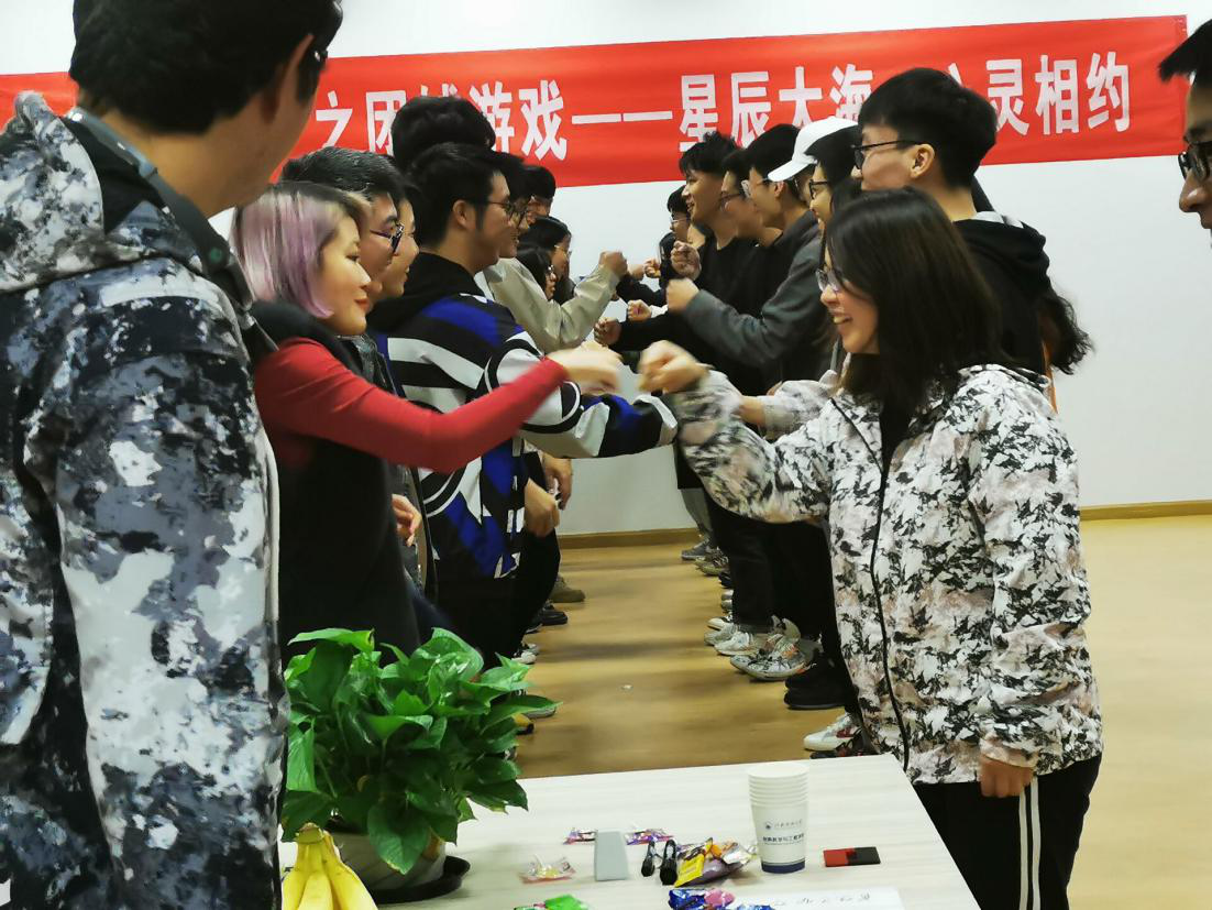 活动开始,辅导员刘甜甜对到场的学生表示了热烈欢迎,同时希望大家在此次活动中学会与人交流,学会分工合作,要发掘自身的价值和闪光点,并表示自己也将加入到游戏中,现场气氛迅速升温。在团体项目中,大家先进行了一个放松释压游戏,所有人紧闭双眼,在主持人的引导下,放松身体,倾听内心;随后又进行了“相见欢”的游戏,让所有学生在主动表达,称赞他人,拥抱接触中学会与人交往;最后所有人齐心协力共同完成了高难度的“信任游戏”。