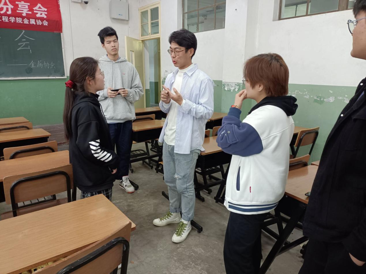 本次交流会由金属协会会长朱亚岩同学主持。首先,朱同学介绍了本次交流会的流程。接着由窦金杰学长给同学们讲解本创,即本科生创新创业训练计划。本创时间为一整年,主要活动是跟随导师做创新项目,参与实验以及撰写论文。本创对大家的动手能力和创新能力都有一定的提升,同时对自己的研究能力也是一种锻炼。窦学长表示本创对于自己的帮助特别大,无论是学习还是保研。然后,窦学长就自己的工作和学习分享了一些经验。他特别强调,只有在平日里做到详细的规划,才能做到工作与学习两不误。同时也向同学们讲述了如何争取保研资格,以及在夏令营中需要注意的问题。最后的互动环节,同学们积极提出了一些问题,窦学长一一做出了解答。