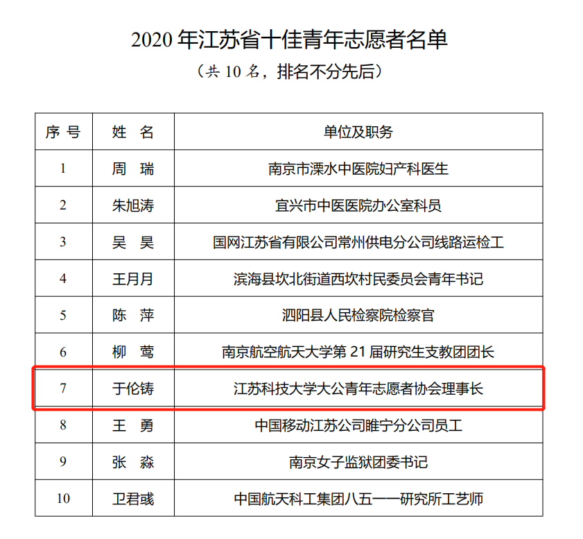 3月5日,2021年江苏省暨南京市青年志愿服务主题日活动在南京举行。本次活动由共青团江苏省委、江苏省文明办、江苏省民政厅、江苏省志愿者协会主办,共青团南京市委等单位承办。活动现场表彰了2020年度省十佳青年志愿者和十佳青年志愿服务项目团队等。我校beat365正版唯一官网焊接技术与工程专业2017级本科生于伦铸获评“江苏省十佳青年志愿者”,是本届年龄最小的“十佳”获奖者。据悉,此次“十佳青年志愿者”评选分为初选推报、专家复评、候选答辩、综合评定等环节,我校于伦铸同学从全省264名“优秀青年志愿者”中脱颖而出,经过二十强候选答辩后,最终成功当选“十佳”。