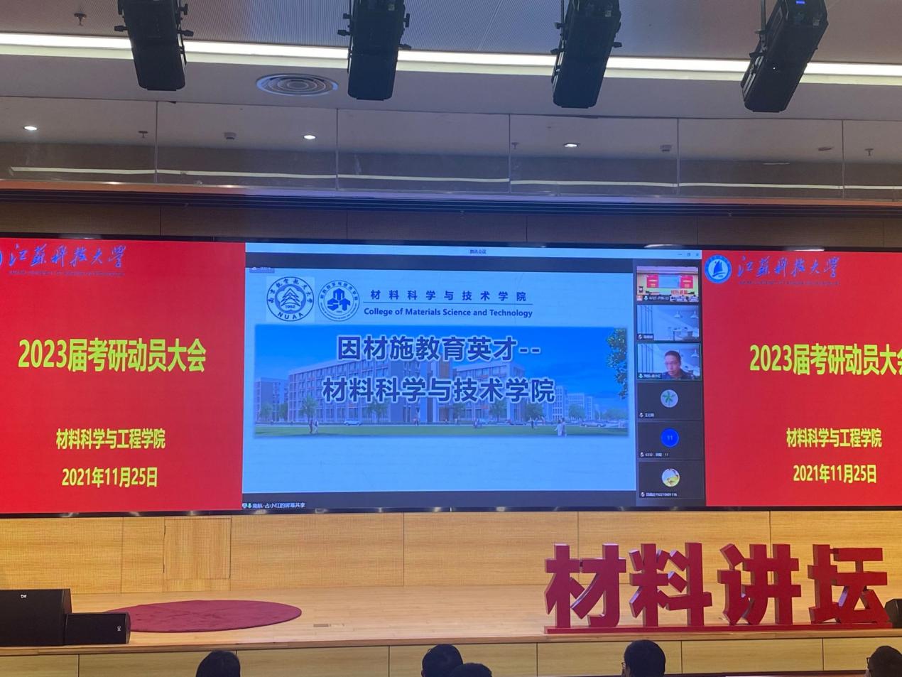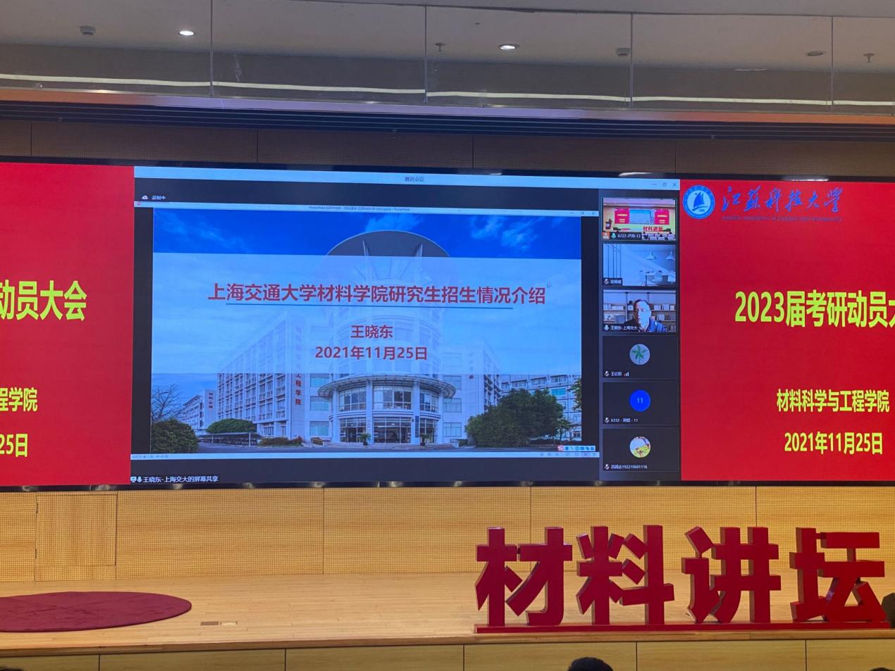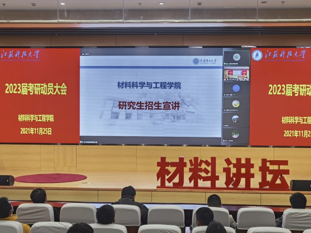 11月25日下午,江苏科技大学材料学院2023届考研动员大会于图书馆105报告厅举行。本次动员大会特邀上海交通大学王晓东、大连理工大学王红阳、南京航空航天大学占小红和江苏科技大学李瑞峰四位杰出博士生导师作为主讲嘉宾参会,会议由材料学院党委副书记赵莉主持。2019级全体学生、2020级部分学生代表参与此次会议。