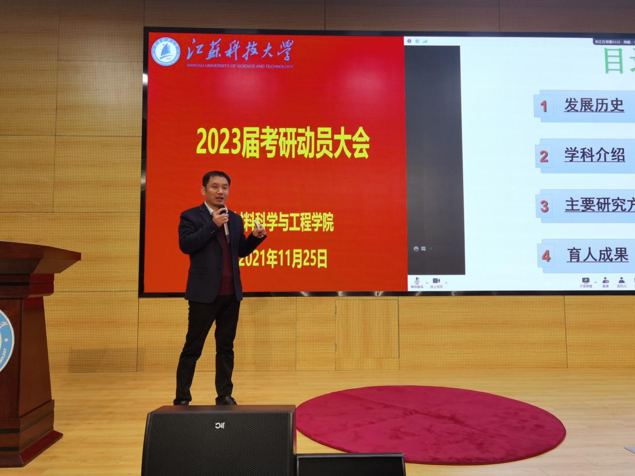 本次动员大会共分为线下、线上两部分。其中线下会议现场由李瑞峰主讲,他从江科大材料学院发展历史、学科介绍、主要研究方向及成果、育人成果这四点切入,准确详细地展示了学院的各项优势,并表示研究生应该具备全面素质、大格局、高境界和宽胸怀,要将自己的人生价值与“中国梦”有机结合。