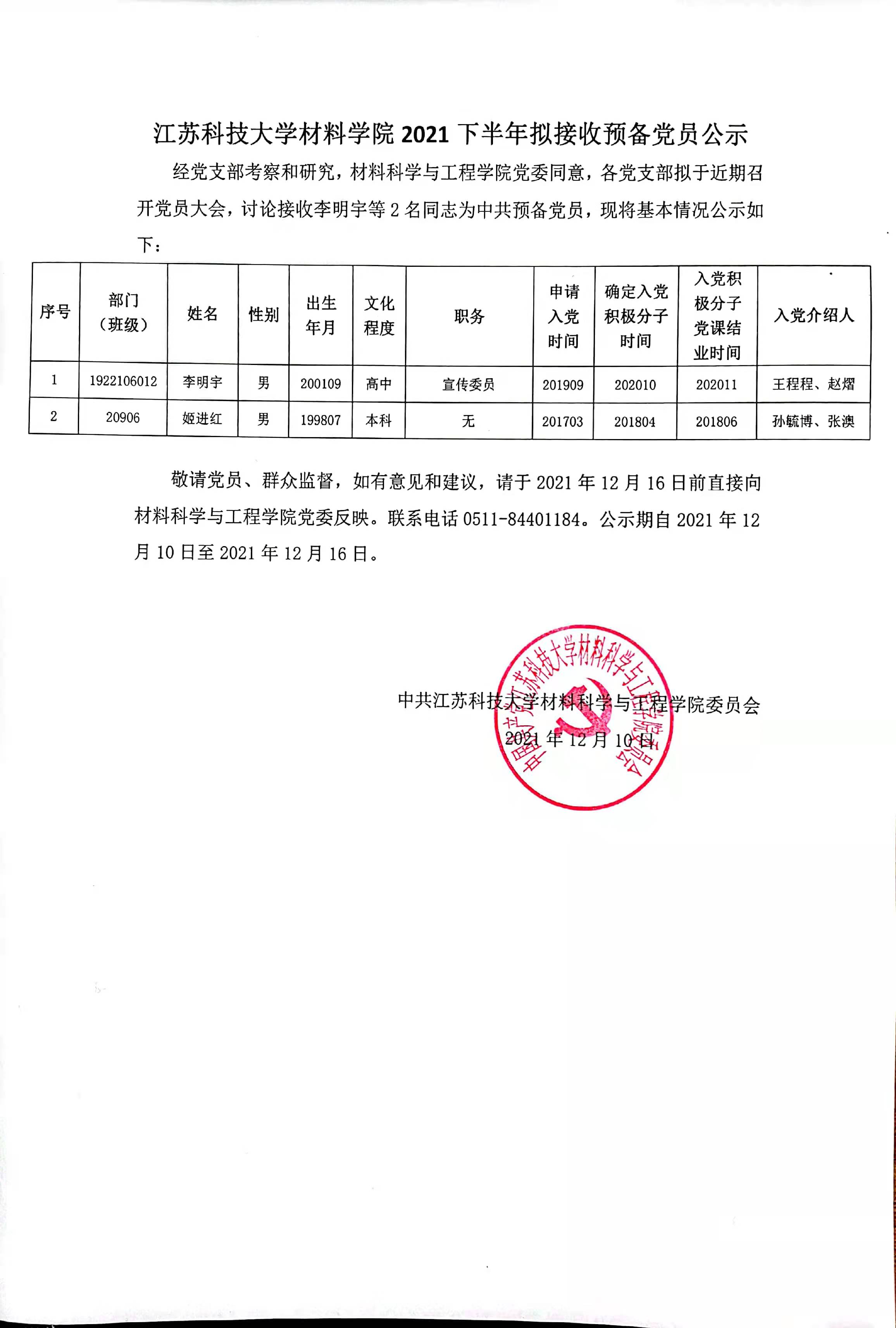 江苏科技大学材料学院2021下半年拟接收预备党员公示