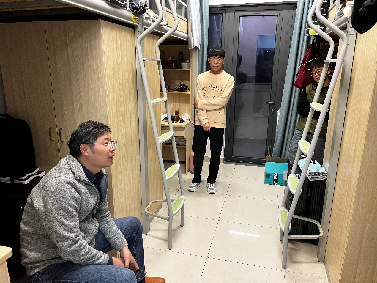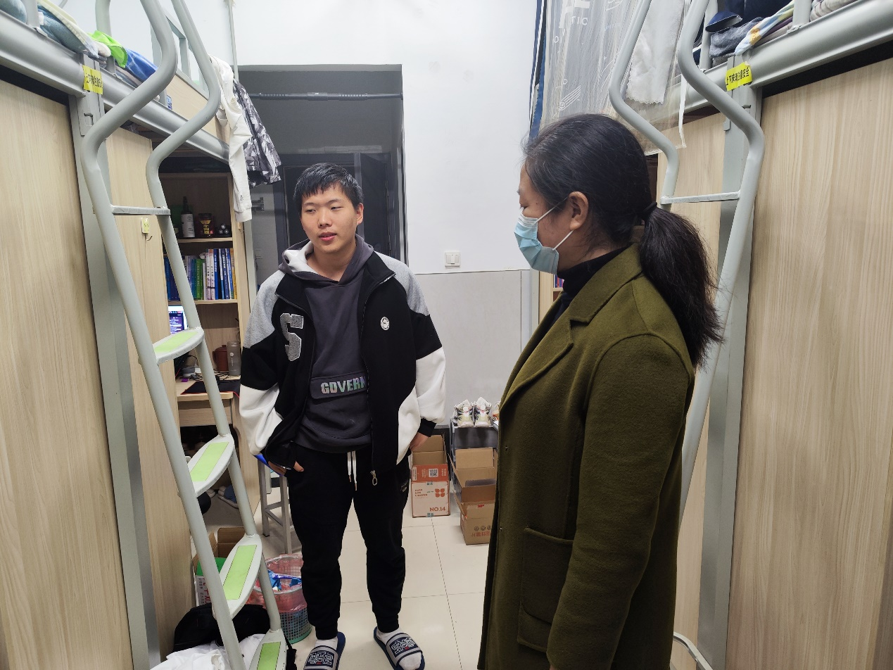 进入宿舍后,晏院长与同学们亲切交谈。作为学业导师,晏院长了解班级每一名同学的情况,关心学习存在困难的同学有没有做好复习准备,省外的同学假期回家有没有难度。在403宿舍,晏院长询问大家有没有经常锻炼身体,体质测试有没有顺利通过,并向同学们分享了自己求学的经历,告诫同学们不要沉迷游戏,希望每位同学走出宿舍,走进图书馆,制定好学习计划,劳逸结合,丰满自己的大学生活,不留遗憾。晏院长对大家的谆谆叮嘱,让大家都备受鼓舞,纷纷和老师定下学期不挂科、明年努力考研的约定。