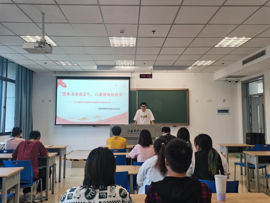 九秩薪传,共庆芳华,正值江苏科技大学九十周年华诞,为深入学习贯彻习近平总书记关于全面从严治党和党风廉政建设系列重要讲话精神,11月3日材料学院本科生第三党支部积极响应学校号召,开展“固本清源凝正气,以廉铸魂树新风”特色廉洁文化教育活动,推动党支部廉洁文化建设走深走实,努力营造廉荣贪耻、向上向善的校园氛围,献礼江科大。