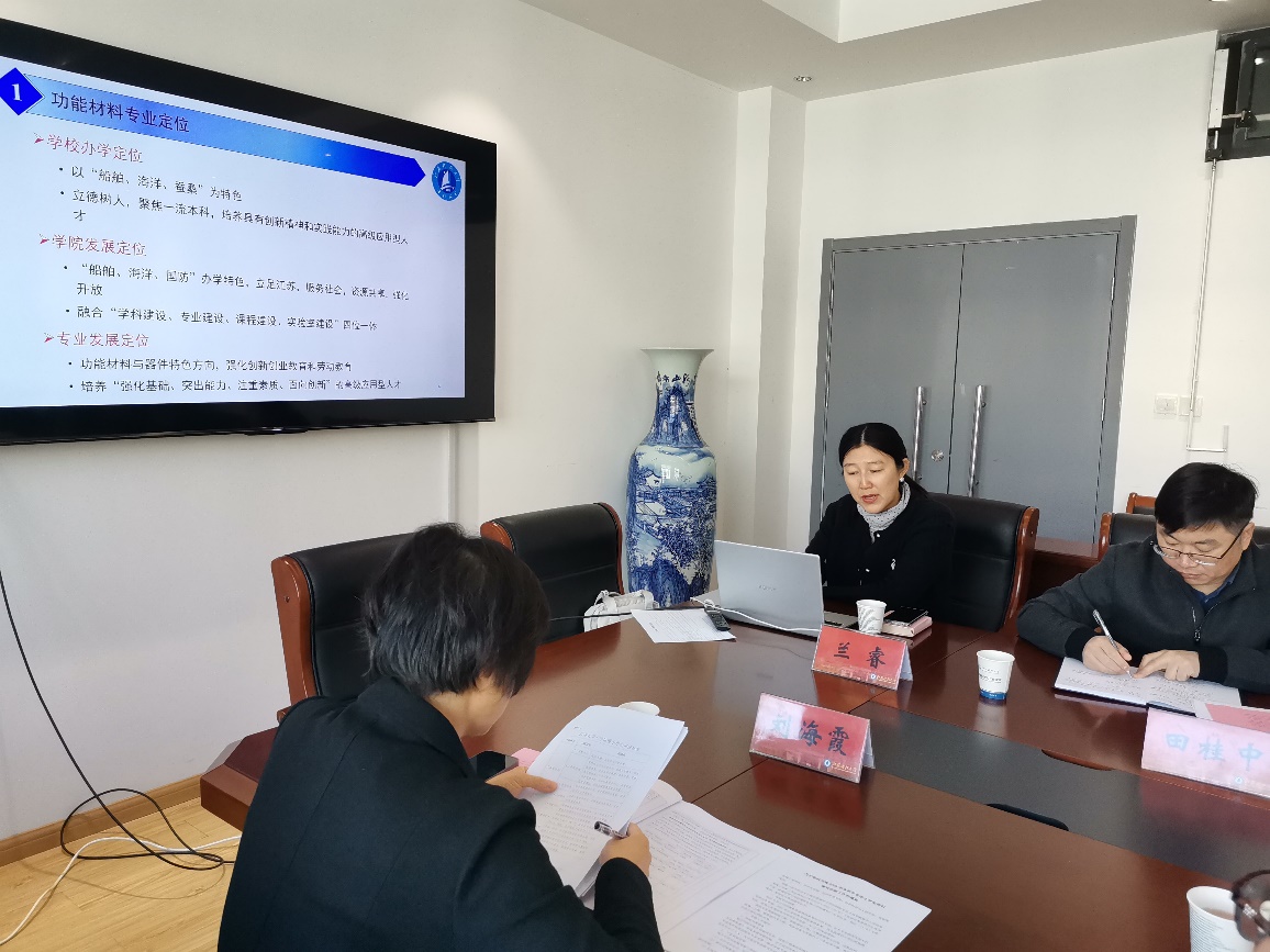 兰睿副教授从专业定位、师资队伍、培养方案与课程设置、教学条件、教学规范情况、质量保障等方面汇报了功能材料专业建设情况。评审专家组对我院在产教融合资源优势发挥、教学团队组织、课程体系建设等方面的相关工作给予了充分肯定并提出了宝贵建议。