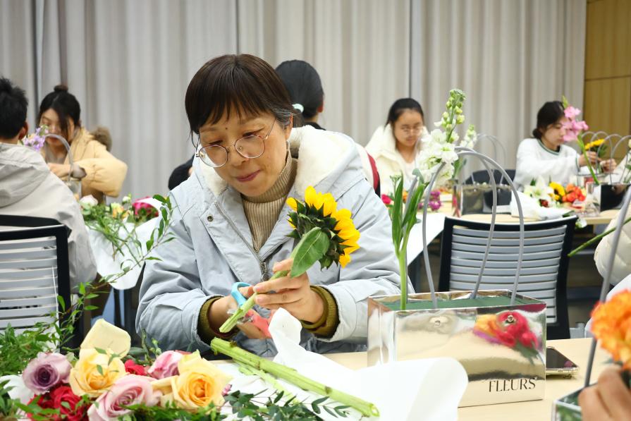 活动现场,各式各样的花卉和绿植琳琅满目,从经典的玫瑰、百合到现代感的干花,应有尽有。师生们在花艺老师的指导下,认真学习插花技巧,从修剪花枝、搭配色彩到构图设计,每一步都充满了创意与想象。