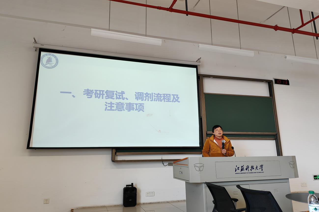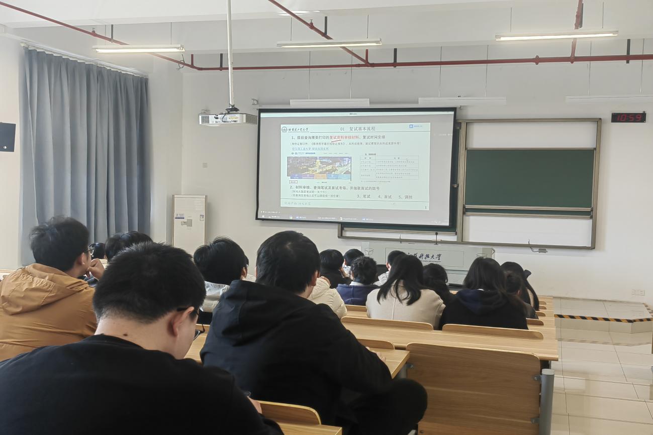学院招生办公室陈部湘老师详细讲解了考研复试、调剂流程及注意事项。她结合多年招生经验,从复试细则、调剂政策到系统操作进行了全面解读,提醒同学们密切关注目标院校的复试通知,提前准备好相关材料,并保持良好的心态。