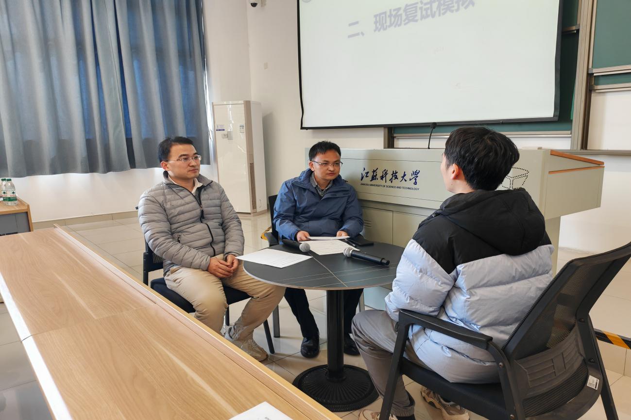 模拟面试环节,夏春智、刘坤副教授担任面试官,2021级焊接专业高增超为模拟考生。两位老师在模拟结束后进行了详细点评。夏春智老师指出复试考察的是学生的综合能力,不仅是专业知识基础,还包括沟通表达能力、临场应变能力等;刘坤老师建议所有同学应勤练英语口语,掌握重点专业词汇,为英语面试做好充分准备。