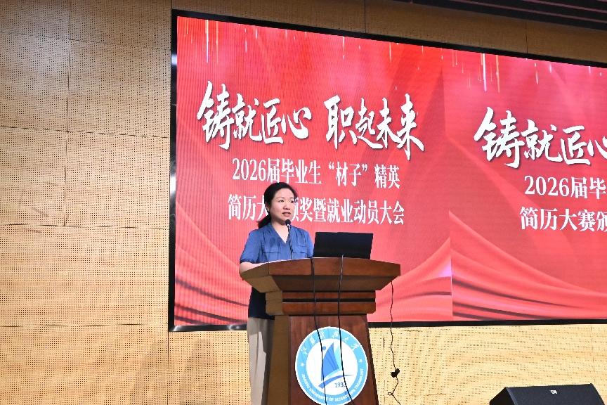 近日,江苏科技大学材料学院在长山校区图书馆B105 报告厅举办 “铸就匠心、职起未来”2026届毕业生就业动员大会,为踏上求职征程的学子们搭建了技能提升与经验交流的平台。学院党委副书记杨海涛主持会议,二重(镇江)重型装备有限责任公司人事经理章婕女士、学院就业辅导员曹天龙、毕业班辅导员刘珣、刘雨庭、刘甜甜及2026届毕业生参加大会。