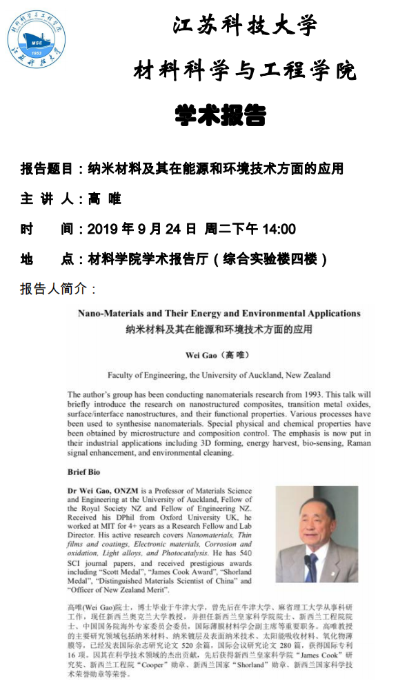讲座预告|高唯:纳米材料及其在能源和环境技术方面的应用( 2019.09.24)