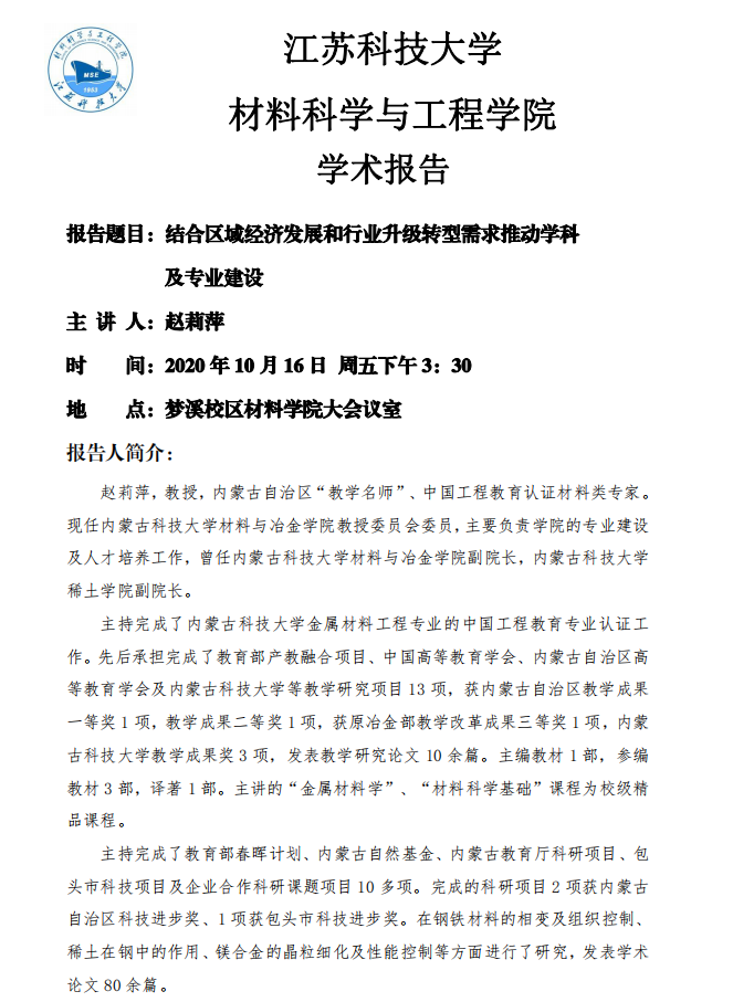 讲座预告|赵莉萍:结合区域经济发展和行业升级转型需求推动学科及专业建设(2020.10.16)