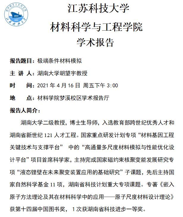 讲座预告|胡望宇:极端条件材料模拟(2021.4.16)