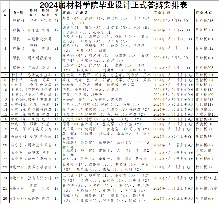 据悉,2024届毕业论文答辩将于5月30日正式开始,共有417人参与答辩,共26组。具体安排如下: